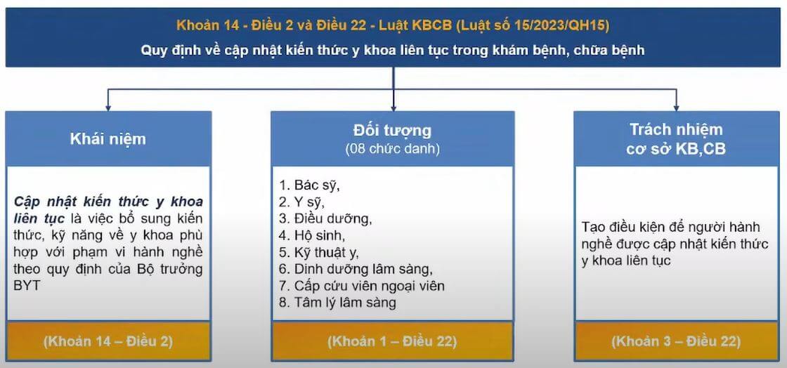 Quy định này được ban hành tại Thông tư số 32/2023/TT-BYT ngày 31 tháng 12 năm 2023, áp dụng từ ngày 01 tháng 01 năm 2024, sau khi Luật Khám bệnh, chữa bệnh số 15 năm 2023 có hiệu lực. Khái niệm “cập nhật kiến thức y khoa liên tục” được đưa vào để thay thế cho khái niệm “đào tạo liên tục” theo Thông tư số 22/2013/TT-BYT và Thông tư số 26/2020/TT-BYT.