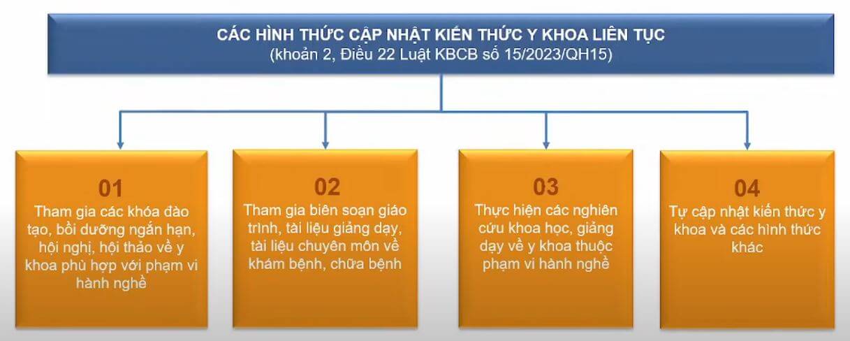 Cập nhật kiến thức y khoa liên tục là yếu tố quan trọng giúp người hành nghề y duy trì và nâng cao chất lượng chuyên môn. Dưới đây là các hình thức cập nhật kiến thức y khoa liên tục, phù hợp với phạm vi hành nghề, theo quy định của Thông tư 32/2023/TT-BYT: