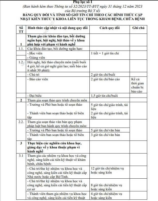 Việc quy đổi các hoạt động cập nhật kiến thức y khoa liên tục sang giờ tín chỉ được thực hiện theo hướng dẫn chi tiết trong Phụ lục số I ban hành kèm theo Thông tư 32/2023/TT-BYT. Các hoạt động đào tạo, bồi dưỡng ngắn hạn, hội nghị, hội thảo và các hình thức khác đều phải tuân theo quy định này để đảm bảo tính thống nhất và chuẩn mực